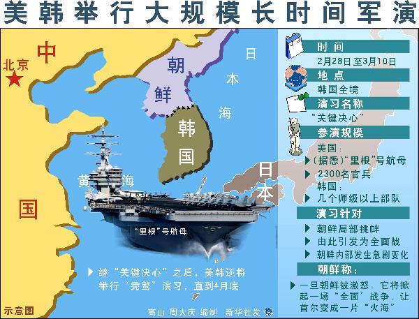 2月28日上午,美國與韓國開始年度例行的“關(guān)鍵決心”和“禿鷲”大規(guī)模聯(lián)合軍演,其中“關(guān)鍵決心”聯(lián)合軍演將持續(xù)11天,“禿鷲”則將一直進行到4月底。同一天,美日聯(lián)合軍演也在日本的橫須賀基地展開,這是兩國的宙斯盾艦首次聯(lián)網(wǎng)實施彈道導(dǎo)彈攔截模擬演習(xí),演習(xí)將一直持續(xù)到3月3日。美韓、美日軍演輪番登場,朝鮮反應(yīng)強烈,半島局勢再次緊張。