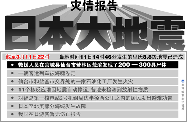 日本東北部海域當(dāng)天發(fā)生的里氏8.8級(jí)(中國(guó)地震局測(cè)定為里氏8.6級(jí))地震及其引發(fā)的海嘯迄今已造成至少500人死亡,大量人員受傷或失蹤,尚不清楚有無中國(guó)公民傷亡。