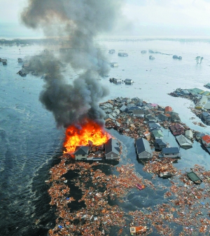 昨日,日本仙臺,經(jīng)歷了地震和海嘯襲擊后,被淹沒的房屋起火。