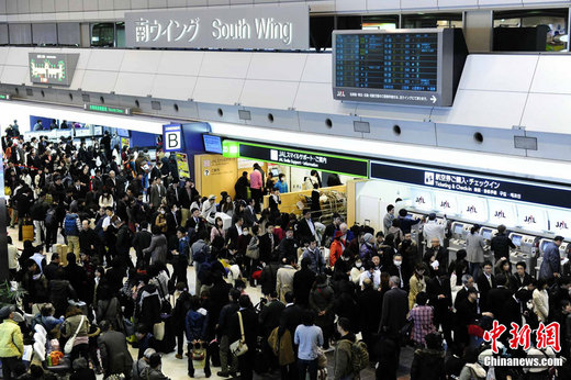 3月12日下午,因11日發(fā)生的日本東北地區(qū)大地震而滯留東京羽田機場的大量旅客正在排隊等候最新的航班情況。中新社發(fā) 侯宇 攝