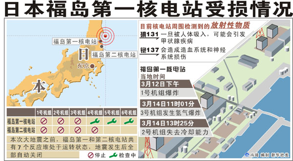 福島第一核電站的1號(hào)機(jī)組和3號(hào)機(jī)組在11日的地震發(fā)生后喪失冷卻功能,出現(xiàn)反應(yīng)堆堆芯燃料部分熔毀,并先后發(fā)生氫氣爆炸。