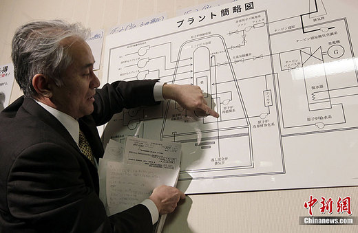 日本政府表示,當(dāng)?shù)貢r(shí)間15日晨6時(shí)10分左右,福島第一核電站2號(hào)反應(yīng)堆附近傳來爆炸聲。早些時(shí)候的報(bào)道指出,福島第一核電站2號(hào)反應(yīng)堆容器出現(xiàn)部分破損,這表明可能導(dǎo)致更為嚴(yán)重的核泄漏。圖為日本東京核電官員用結(jié)構(gòu)圖講解福島第一核電站2號(hào)機(jī)組爆炸情況。