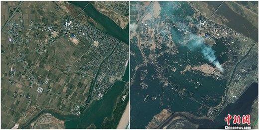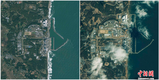 福島縣第一核電站海嘯地震前后對比圖。