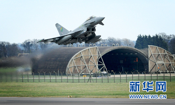 這張英國(guó)國(guó)防部3月20日提供的照片顯示,一架英國(guó)空軍“臺(tái)風(fēng)”式戰(zhàn)斗機(jī)從英國(guó)林肯郡一個(gè)空軍基地起飛參加對(duì)利比亞軍事行動(dòng)。英國(guó)國(guó)防部20日說(shuō),皇家空軍“旋風(fēng)”戰(zhàn)機(jī)已從英國(guó)東部諾福克郡飛赴利比亞,執(zhí)行轟炸任務(wù)。19日的行動(dòng)主要針對(duì)利比亞防空體系,英國(guó)對(duì)于第一階段空中打擊利比亞的結(jié)果“十分滿意”。新華社發(fā)(英國(guó)國(guó)防部照片)