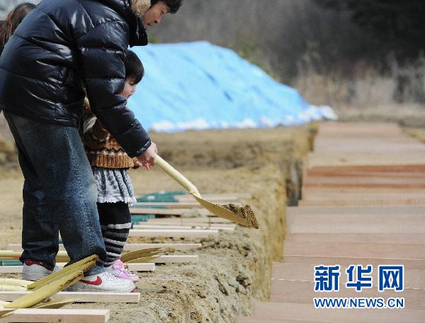 3月22日,在日本宮城縣東松島市,一名小女孩在大人的幫助下向地震和海嘯遇難者的靈柩上撒土。新華社/共同社