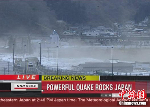 日本近海3月11日發(fā)生強(qiáng)烈地震,首都東京震感強(qiáng)烈。日本氣象廳隨即發(fā)布了海嘯警報(bào),稱地震將引發(fā)約6米高海嘯。圖為日本釜石市港口邊房屋受到海嘯沖擊。