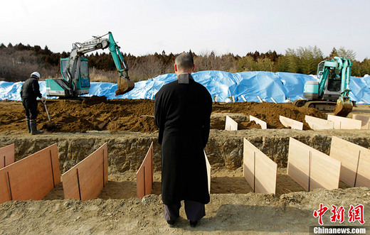 3月22日,宮城縣東松島市集中埋葬多名遇難者,日本僧侶在葬禮現(xiàn)場為遇難者祈禱。