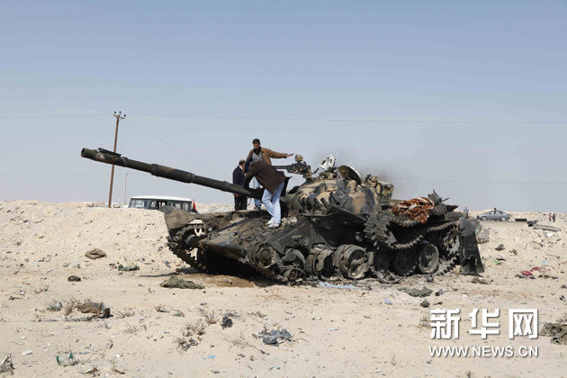 3月26日,在利比亞第二大城市班加西以南的艾季達比耶,反政府武裝者爬上一輛繳獲的坦克。利比亞反政府武裝當日宣布重新奪取東部重鎮(zhèn)艾季達比耶。艾季達比耶距反政府武裝大本營、利比亞第二大城市班加西大約160公里。利比亞政府軍本月中旬奪取這座城市。新華社發(fā)(納賽爾·努里攝)