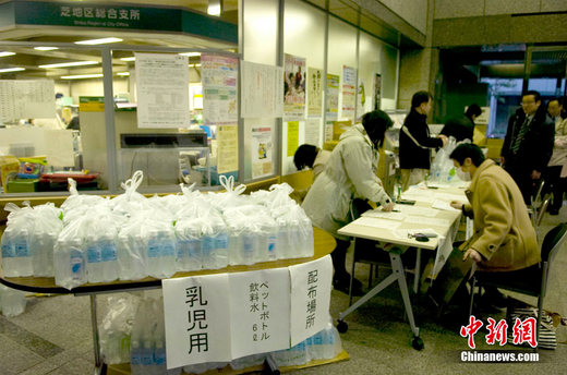 24日,由于東京部分自來水中檢測出的放射性碘超過嬰兒攝取上限,都政府開始向有嬰兒家庭發(fā)放共計24萬瓶飲用水。圖為東京都港區(qū)政府向有嬰兒家庭發(fā)放飲用水。中新社發(fā) 孫冉 攝