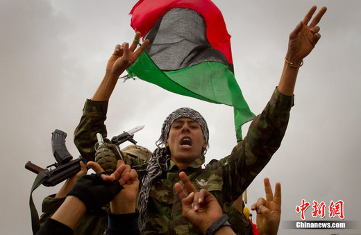 2011年3月21日,班加西市郊,反政府武裝士兵慶祝勝利。