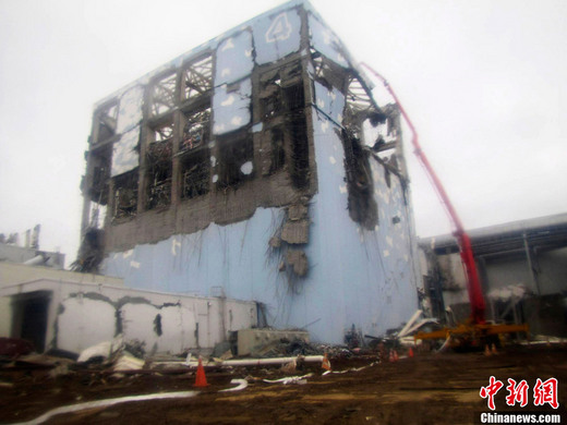 由東京電力公司3月22日拍攝,并于當天公布的圖片顯示,工作人員正嘗試向福島第一核電站4號反應堆進行噴水作業(yè)。