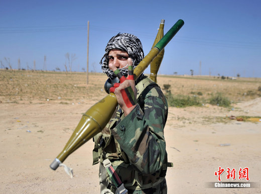 2011年3月23日,利比亞東部重鎮(zhèn)艾季達比耶市郊,一名手持火箭彈的反政府武裝士兵打出“勝利”的手勢。