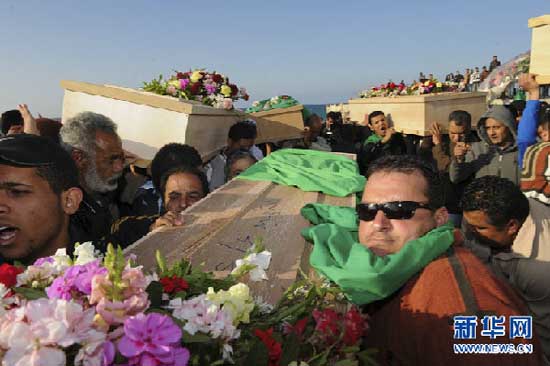 資料圖片:3月24日,在利比亞首都的黎波里,市民抬著即將下葬的棺槨走向一座公墓。利比亞官方當(dāng)日宣布,近100名平民在西方聯(lián)軍空襲中喪生。新華社記者楊光攝
