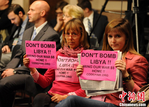 圖為美國著名反戰(zhàn)組織“粉紅密碼”兩名成員當日在參議院軍事委員會的聽證會上舉著反對轟炸利比亞的標語進行抗議。中新社發(fā) 吳慶才 攝