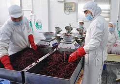 中國(guó)江蘇菜華食品公司加緊生產(chǎn)出口日本的紫蘇腌茄子。攝于3月31日。(共同社)