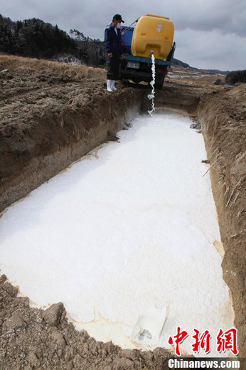 3月23日,日本福島縣Iitate,一位農(nóng)民將牛奶倒入土坑中。福島縣周邊地區(qū)原奶和蔬菜等農(nóng)畜產(chǎn)品的受輻射污染范圍23日呈擴(kuò)大態(tài)勢(shì),首相菅直人當(dāng)天首次要求人們不要食用福島縣生產(chǎn)的一些種類的農(nóng)產(chǎn)品。