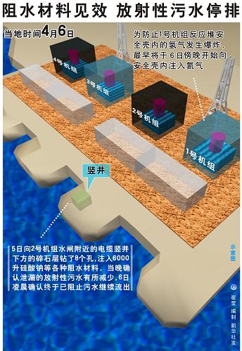 東京電力公司2日發(fā)現(xiàn)高放射性的污水從2號(hào)機(jī)組水閘附近電纜豎井的裂縫中流入海中,灌注混凝土以及吸水膨脹的高分子材料等封堵方法都未能奏效。5日,東京電力公司在電纜豎井下方碎石層中開鑿8個(gè)孔,注入6000升俗稱“水玻璃”的硅酸鈉等各種阻水材料,當(dāng)晚確認(rèn)泄漏的放射性污水量減少,6日早晨確認(rèn)污水已停止外泄。