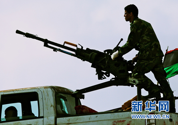 4月6日,在利比亞東部城市布雷加前線,一名反政府軍士兵坐在載有重型機關(guān)槍的卡車上。在北約空軍的空襲配合下,反政府軍當(dāng)天向布雷加發(fā)起進攻,但尚不確定是否已攻占布雷加城。新華社記者才揚攝