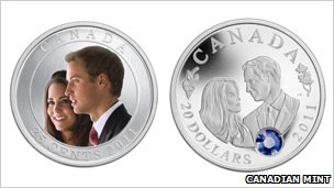面值20加元的銀幣售價105加元(109美元或67英鎊),里面鑲有藍(lán)寶石顏色的圓形水晶來象征新娘的訂婚戒指。