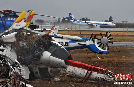 4月19日,一架東京飛抵仙臺(tái)的航班降落在跑道上,機(jī)場(chǎng)旁邊的日本航空大學(xué)遭受“3.11”地震海嘯襲擊已經(jīng)一個(gè)多月,各種教學(xué)飛機(jī)損失極其慘重,宛如遇難飛機(jī)廢墟場(chǎng)。中新社發(fā) 賈國(guó)榮 攝
