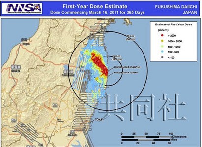 模擬圖顯示,核電站西北40~50公里范圍內(nèi)1年累積輻射量可能超過(guò)20微希。模擬圖根據(jù)飛機(jī)獲得的監(jiān)測(cè)數(shù)據(jù)繪制,以人在室內(nèi)受到的輻射量也不會(huì)減少為假設(shè)。