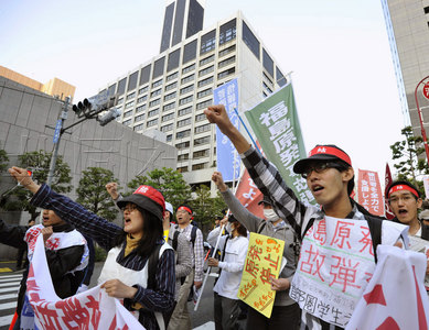 24日下午,日本民眾在東京都千代田區(qū)的東京電力總公司附近游行反對核電。(共同社)