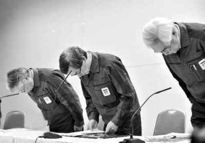 4月13日,在日本東京電力公司總部,東京電力公司社長(zhǎng)清水正孝(中)及兩名副社長(zhǎng)在新聞發(fā)布會(huì)上鞠躬致歉。當(dāng)天,東電在東京總部召開(kāi)新聞發(fā)布會(huì),社長(zhǎng)清水正孝在發(fā)布會(huì)上就福島核危機(jī)向公眾致歉。 新華社/法新