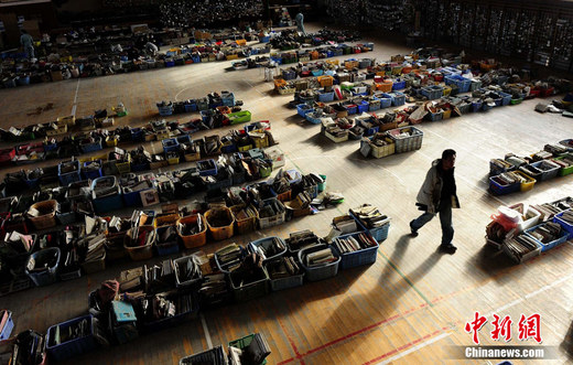 4月18日下午,一名日本人經(jīng)過設(shè)在宮城縣名取市一所小學(xué)校體育館里的受災(zāi)物品匯總處,這里匯集了附近搜尋到的影集、畢業(yè)證書、書包等物品,供災(zāi)民前來尋找。 中新社發(fā) 侯宇 攝