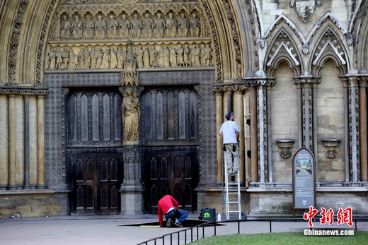 距英國(guó)威廉王子和凱特﹒米德?tīng)栴D大婚還有兩天,婚禮舉辦地倫敦威斯敏斯特教堂已拒絕游人進(jìn)入。圖為工人們27日在對(duì)教堂大門(mén)進(jìn)行最后的修繕。中新社發(fā) 魏群 攝
