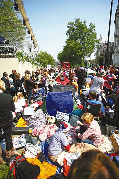 西敏寺教堂對(duì)面的行人路擠滿了占位的熱情民眾。香港文匯報(bào)記者沈平 攝