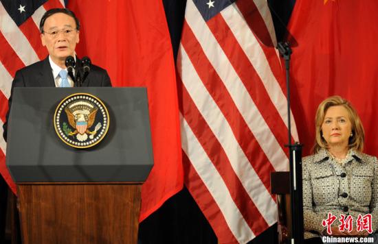 當(dāng)?shù)貢r(shí)間5月9日上午,第三輪中美戰(zhàn)略與經(jīng)濟(jì)對(duì)話(huà)在華盛頓開(kāi)幕。中國(guó)副總理王岐山、國(guó)務(wù)委員戴秉國(guó)、美國(guó)副總統(tǒng)拜登、國(guó)務(wù)卿克林頓、財(cái)長(zhǎng)蓋特納等出席開(kāi)幕式。圖為王岐山致辭。中新社發(fā) 張煒 攝