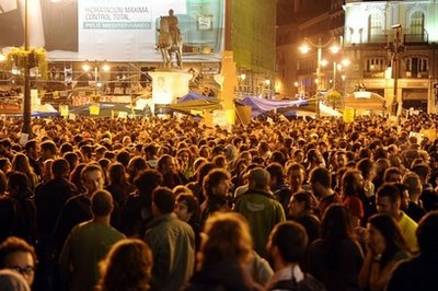 據(jù)報(bào)道,西班牙的“真民主抗議組織”在社交網(wǎng)上呼吁舉行示威,得到回應(yīng),在西班牙首都馬德里市中心的太陽門廣場(chǎng)(Puerta del Sol Square)上市,示威者們安營(yíng)扎寨,日以繼夜,抗議政府應(yīng)對(duì)經(jīng)濟(jì)危機(jī)不力,并誓言要待到本周日地方選舉開始為止。