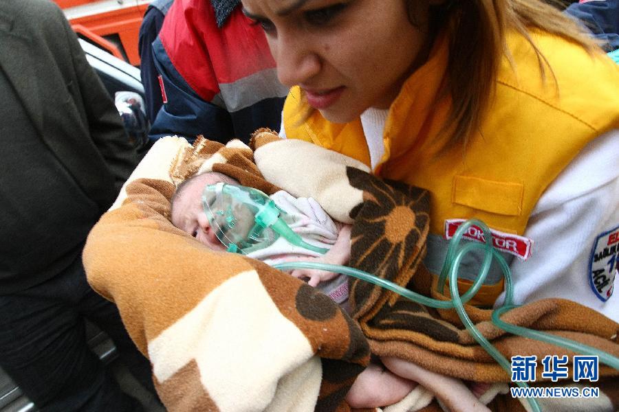 10月25日,在土耳其東部凡省的埃爾吉斯,一名才兩周大的女嬰阿茲拉被救援隊(duì)員救出。
