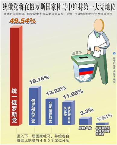 根據(jù)俄中央選舉委員會5日宣布的初步統(tǒng)計結果,統(tǒng)俄黨在新國家杜馬中有可能獲得450個議席中的約238席,達到“絕對多數(shù)”。俄羅斯共產(chǎn)黨、公正俄羅斯黨、俄自由民主黨可能分別獲得92席、64席和56席。