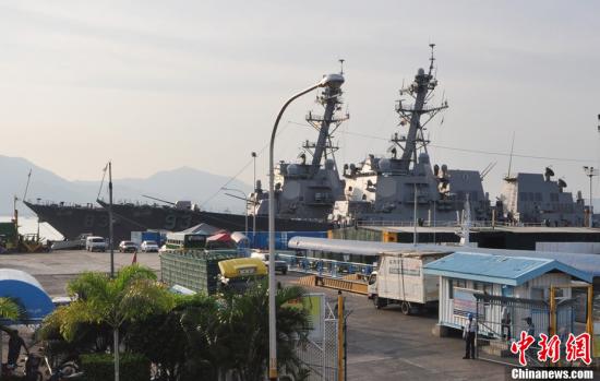 2011年6月28日,菲律賓和美國海軍2011年度“海上聯(lián)合戰(zhàn)備訓(xùn)練演習(xí)”CARAT在菲律賓西南部巴拉望省省會普林塞薩港市開幕。圖為?吭诟劭诘拿绹\妼(dǎo)彈驅(qū)逐艦“鐘云”號(93)和“霍華德”號(83)。中新社發(fā) ERIC 攝