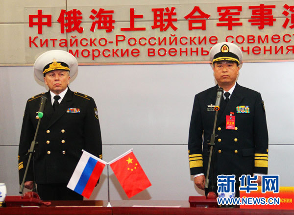 4月22日,俄羅斯海軍副參謀長、俄方總導演蘇哈諾夫海軍少將(左)和中國海軍副司令員、中方總導演丁一平海軍中將(右)擔任雙方聯合軍演總導演。新華社記者 查春明攝