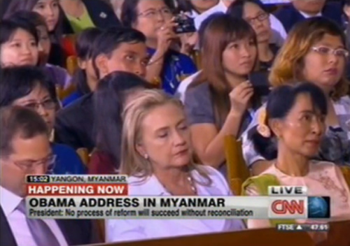 當(dāng)天,坐在希拉里身旁聽奧巴馬演講的是緬甸全國民主聯(lián)盟領(lǐng)導(dǎo)人昂山素季。