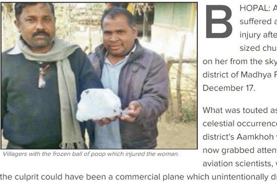 臺媒稱,比被鳥屎砸更衰!印度一名60歲婦人,日前遭到足球般大小的“藍冰”砸中,造成肩部受傷。而這顆神秘的巨大“藍冰”,也引起許多專家的熱烈討論,因為這個不明物體,很可能是從飛機掉出來的“排泄物結(jié)晶”。