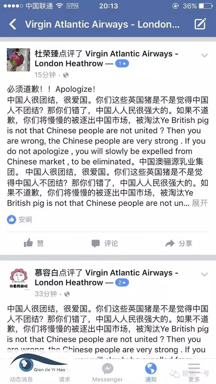 3月18日晚7點(diǎn),數(shù)千名“帝吧網(wǎng)友”同時(shí)在線向維珍航空fb主頁發(fā)起進(jìn)攻,而此次事件的導(dǎo)火索就是一名中國乘客在維珍航空的飛機(jī)上被一名外籍男子侮辱為“中國豬”。