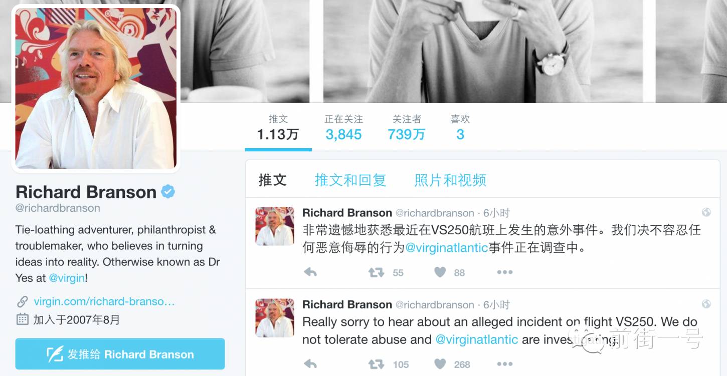 事后維珍航空創(chuàng)始人理查德·布蘭森 (Richard Branson) 也在自己的 Twitter 賬號(hào)上用英文和中文公開致歉并稱會(huì)持續(xù)調(diào)查該事件。