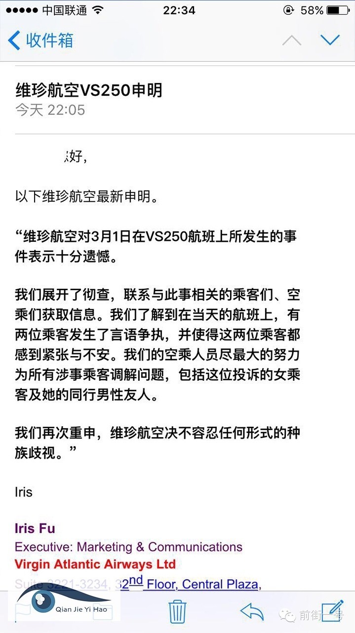 截止到3月18日晚10點(diǎn),維珍航空公司仍未就此事公開發(fā)表聲明或致歉等信息,但維珍航空公司fb主頁面被刷屏仍在繼續(xù)。而就在這個(gè)時(shí)間,維珍航空公司給前街一號(hào)記者發(fā)來郵件,全文如下