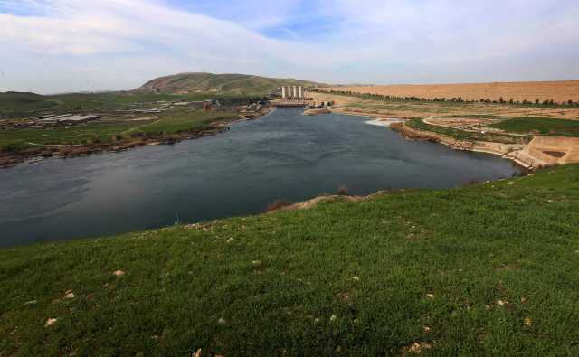 圖為摩蘇爾大壩附近,當(dāng)?shù)厝嗽诘赘窭锼购影斗叛颉P氯A/法新。