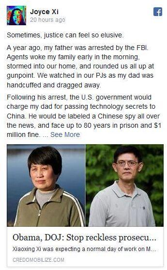 郗雨姍在臉書(shū)上寫(xiě)道:自己的父親郗小星不是唯一一個(gè)被美國(guó)政府錯(cuò)誤指控的華裔科學(xué)家。 其他華裔科學(xué)家如陳霞芬(SherryChen)、曹國(guó)慶(Cao Guoqing)和李書(shū)玉(ShuyuLi)也經(jīng)歷了相同的事,他們被控間諜罪,后來(lái)又被毫無(wú)原因地撤銷指控,但是造成的后果對(duì)所有人的家庭都是毀滅性的,而政府卻完全不用為此負(fù)責(zé)。