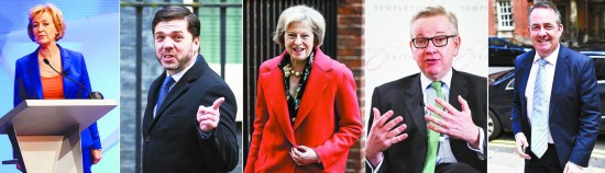 上圖:英國(guó)保守黨6月30日宣布,該黨5名下院議員將競(jìng)選下一任黨魁,勝選者預(yù)計(jì)于今年10月接替卡梅倫出任保守黨新黨魁和新首相。從左至右分別為:負(fù)責(zé)能源事務(wù)的國(guó)務(wù)大臣安德烈婭·利德索姆、就業(yè)和養(yǎng)老金事務(wù)大臣斯蒂芬·克拉博、內(nèi)政大臣特雷莎·梅、司法大臣邁克爾·戈夫和前國(guó)防大臣利亞姆·?怂埂