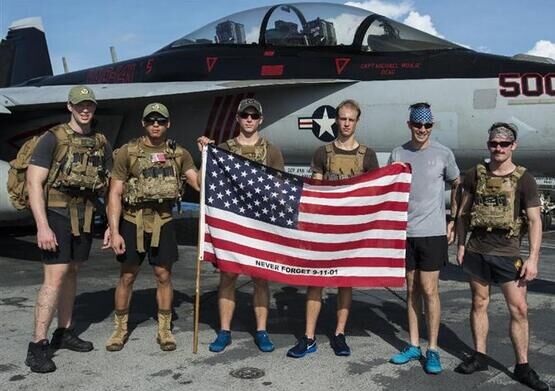 7月4日,美軍士兵等在航行于南海的“羅納德·里根”號航母甲板上舉著星條旗紀(jì)念美國獨立日。
