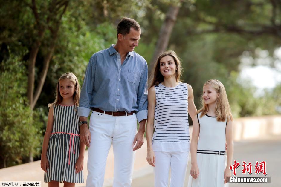 當(dāng)?shù)貢r(shí)間2016年8月4日,西班牙馬洛卡島帕爾馬,西班牙國(guó)王菲利普和王后萊蒂齊亞帶著公主利奧諾和索菲亞在瑪麗溫特宮拍攝全家福。