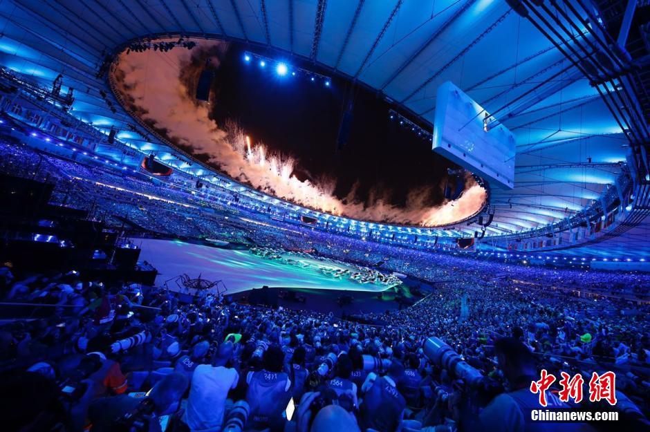 當(dāng)?shù)貢r(shí)間8月5日晚8時(shí),2016里約奧運(yùn)會開幕式在里約熱內(nèi)盧馬拉卡納體育場舉行。圖為開幕式現(xiàn)場表演。中新網(wǎng)記者 盛佳鵬 攝