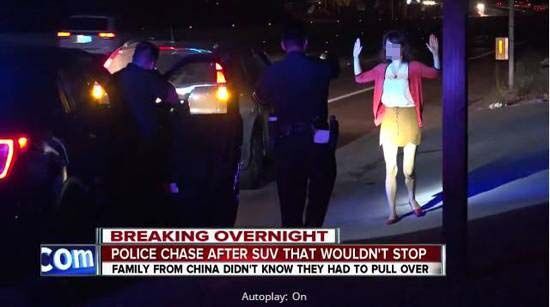 一名滿臉疑惑的中國女子首先下車,試圖與警方交涉,車內(nèi)還有一名男子及一名男童,一家3口看到被警員持槍包圍后頓時被嚇呆。經(jīng)警方盤問后,才知道涉事家庭是中國游客,不熟悉當(dāng)?shù)亟煌ǚɡ。?dāng)警方閃燈鳴笛時,他們并不知道自己被要求停車,才引發(fā)該場烏龍追逐戰(zhàn),故沒有對他們作出處罰。