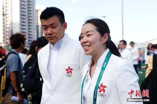 資料圖:帖雅娜、唐鵬夫婦參加中國香港奧運(yùn)代表團(tuán)在里約奧運(yùn)村舉行升旗儀式。中新網(wǎng)記者 富田 攝