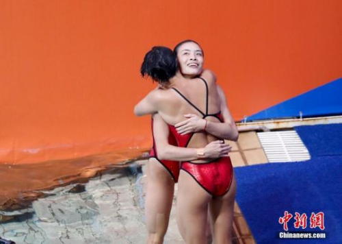 當(dāng)?shù)貢r(shí)間8月7日,在里約奧運(yùn)會女子雙人三米板決賽中,中國選手吳敏霞和施廷懋一路領(lǐng)先,無懸念奪得桂冠。圖為施廷懋擁抱吳敏霞。中新網(wǎng)記者 杜洋 攝